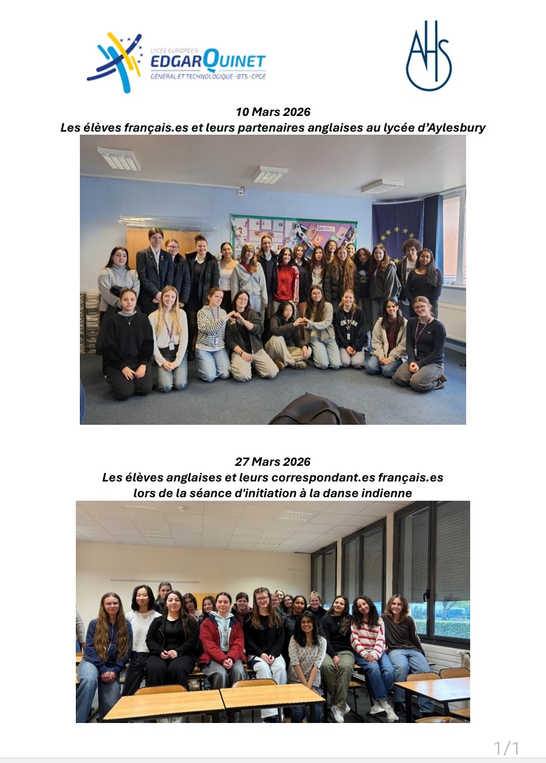 En retour, les élèves anglaises viennent de repartir après une semaine chez leurs correspondant.e.s. Là encore, une semaine riche en visites et activités diverses, dont certaines artistiques (danse indienne et musique) en commun, sans oublier l'immersion en famille, qui a donné naissance à de belles amitiés qui se prolongeront au-delà de l'échange.